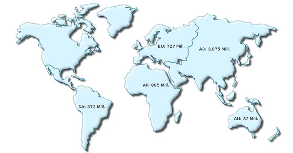 <map borderColor='005879' fillColor='D7F4FF' numberSuffix=' Mill.' includeValueInLabels='1' labelSepChar=': ' baseFontSize='9'> <data> <entity id='NA' value='515' displayValue=' '/> <entity id='SA' value='373' /> <entity id='AS' value='3875' /> <entity id='EU' value='727' /> <entity id='AF' value='885' /> <entity id='AU' value='32' /> </data> </map> |
